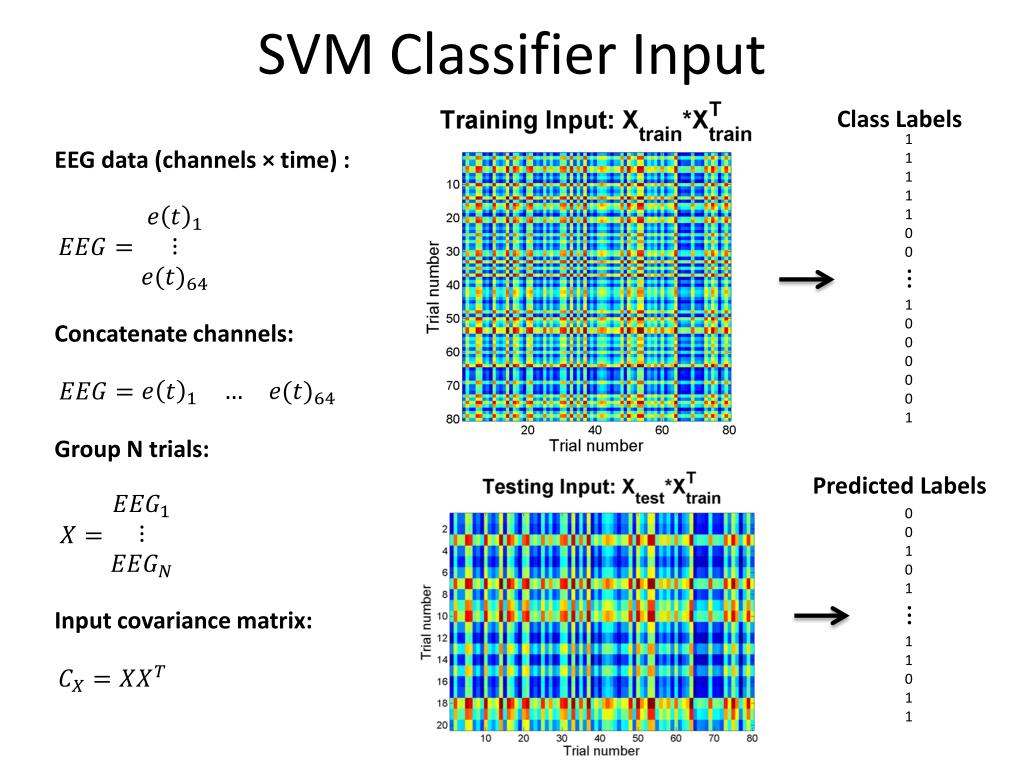 SVM Classifier Input Class Labels 1 1 1 1 1 0 0 1 0 0 0 0 0 1 EEG data (channels × time) : Concatenate channels: Group N trials: Predicted Labels 0 0 1 0 1 1 1 0 1 1 Input covariance matrix: