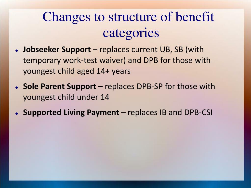 Changes to structure of benefit categories • Jobseeker Support – replaces current UB, SB (with temporary work-test waiver) and DPB for those with youngest child aged 14+ years • Sole Parent Support – replaces DPB-SP for those with youngest child under 14 • Supported Living Payment – replaces IB and DPB-CSI