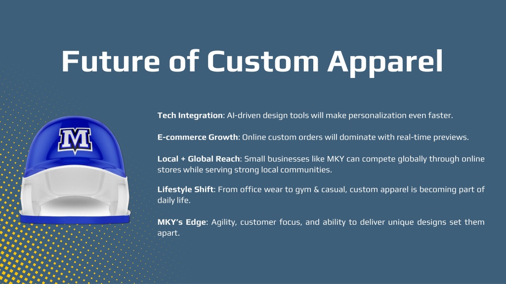 Tech Integration: AI-driven design tools will make personalization even faster. • E-commerce Growth: Online custom orders will dominate with real-time previews. • Local + Global Reach: Small businesses like MKY can compete globally through online stores while serving strong local communities. • Future of Custom Apparel • Lifestyle Shift: From office wear to gym & casual, custom apparel is becoming part of daily life. • MKY’s Edge: Agility, customer focus, and ability to deliver unique designs set them apart.