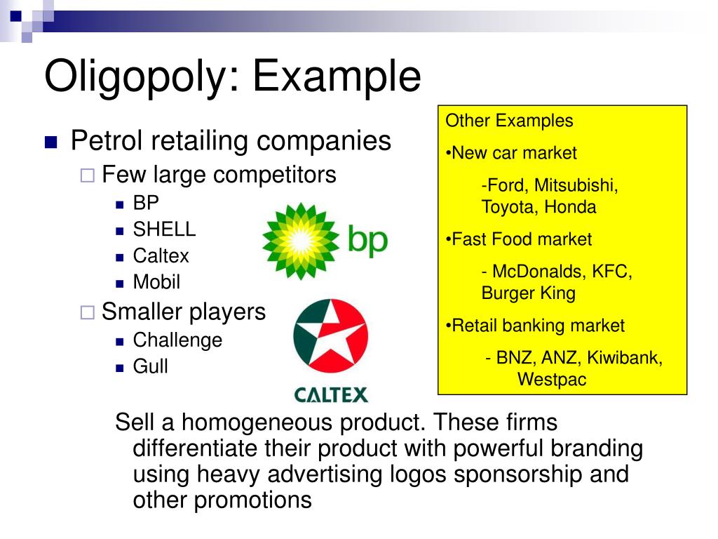 Oligopoly: Example • Other Examples • New car market • -Ford, Mitsubishi, Toyota, Honda • Fast Food market • - McDonalds, KFC, Burger King • Retail banking market • - BNZ, ANZ, Kiwibank, Westpac • Petrol retailing companies • Few large competitors • BP • SHELL • Caltex • Mobil • Smaller players • Challenge • Gull Sell a homogeneous product. These firms differentiate their product with powerful branding using heavy advertising logos sponsorship and other promotions
