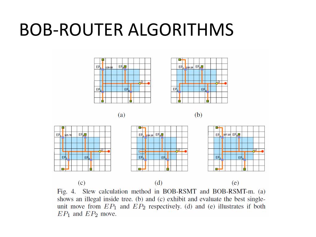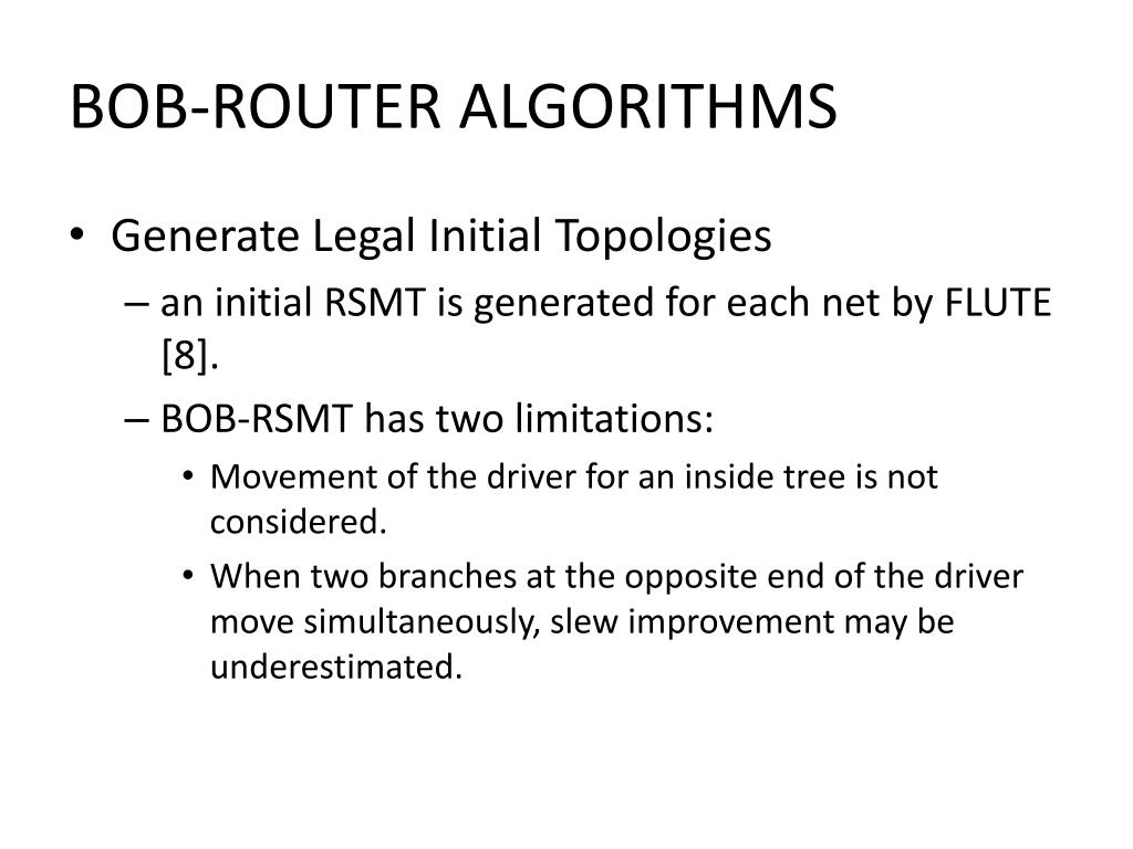 BOB-ROUTER ALGORITHMS • Generate Legal Initial Topologies • an initial RSMT is generated for each net by FLUTE [8]. • BOB-RSMT has two limitations: • Movement of the driver for an inside tree is not considered. • When two branches at the opposite end of the driver move simultaneously, slew improvement may be underestimated.