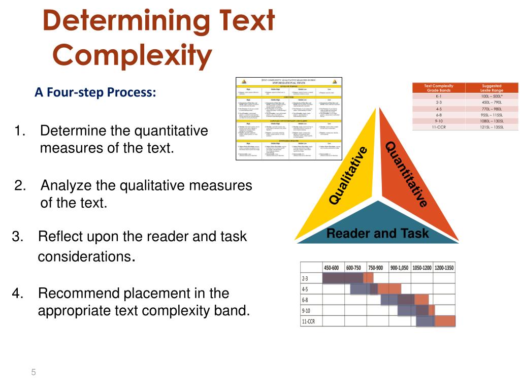 Determining Text Complexity A Four-step Process: Determine the quantitative measures of the text. Quantitative Qualitative Analyze the qualitative measures of the text. Reader and Task Reflect upon the reader and task considerations. Recommend placement in the appropriate text complexity band.