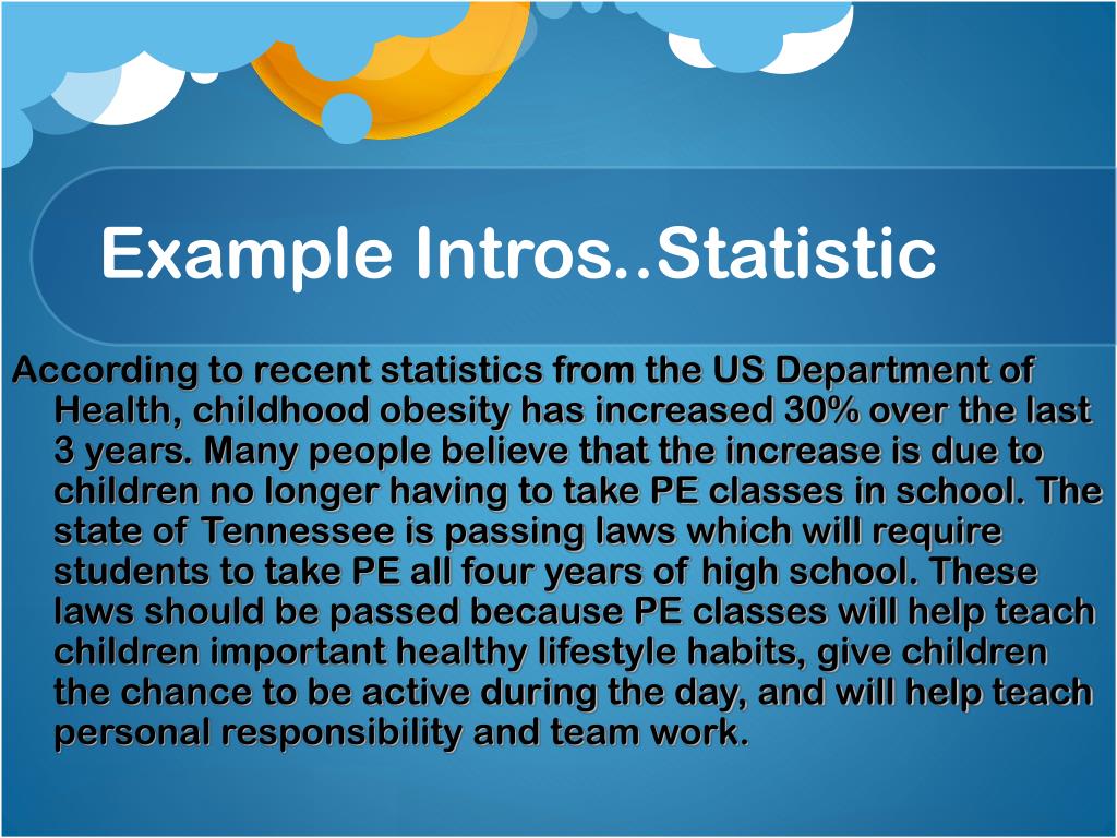 Example Intros..Statistic According to recent statistics from the US Department of Health, childhood obesity has increased 30% over the last 3 years. Many people believe that the increase is due to children no longer having to take PE classes in school. The state of Tennessee is passing laws which will require students to take PE all four years of high school. These laws should be passed because PE classes will help teach children important healthy lifestyle habits, give children the chance to be active during the day, and will help teach personal responsibility and team work.