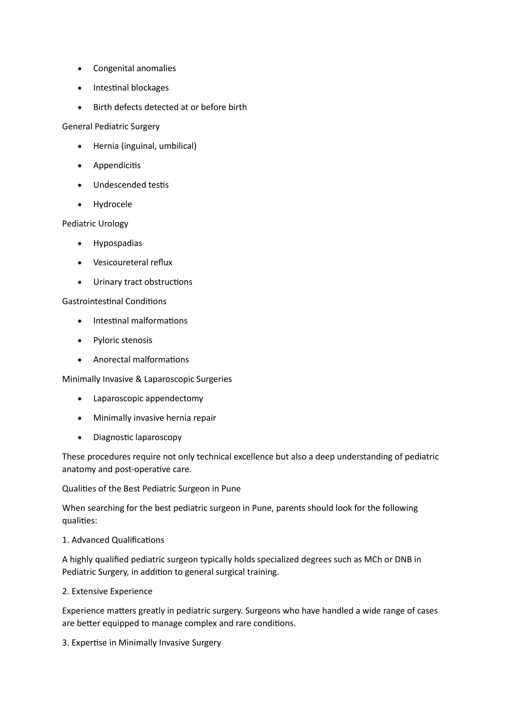 • Congenital anomalies • Intestinal blockages • Birth defects detected at or before birth General Pediatric Surgery • Hernia (inguinal, umbilical) • Appendicitis • Undescended testis • Hydrocele Pediatric Urology • Hypospadias • Vesicoureteral reflux • Urinary tract obstructions Gastrointestinal Conditions • Intestinal malformations • Pyloric stenosis • Anorectal malformations Minimally Invasive & Laparoscopic Surgeries • Laparoscopic appendectomy • Minimally invasive hernia repair • Diagnostic laparoscopy These procedures require not only technical excellence but also a deep understanding of pediatric anatomy and post-operative care. Qualities of the Best Pediatric Surgeon in Pune When searching for the best pediatric surgeon in Pune, parents should look for the following qualities: 1. Advanced Qualifications A highly qualified pediatric surgeon typically holds specialized degrees such as MCh or DNB in Pediatric Surgery, in addition to general surgical training. 2. Extensive Experience Experience matters greatly in pediatric surgery. Surgeons who have handled a wide range of cases are better equipped to manage complex and rare conditions. 3. Expertise in Minimally Invasive Surgery