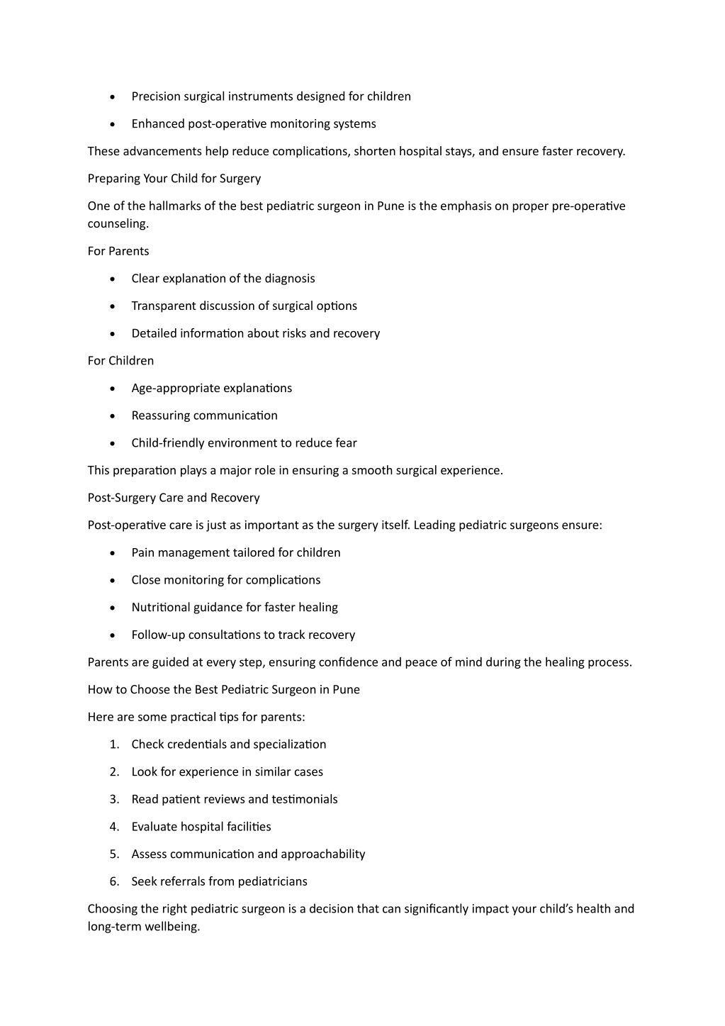 • Precision surgical instruments designed for children • Enhanced post-operative monitoring systems These advancements help reduce complications, shorten hospital stays, and ensure faster recovery. Preparing Your Child for Surgery One of the hallmarks of the best pediatric surgeon in Pune is the emphasis on proper pre-operative counseling. For Parents • Clear explanation of the diagnosis • Transparent discussion of surgical options • Detailed information about risks and recovery For Children • Age-appropriate explanations • Reassuring communication • Child-friendly environment to reduce fear This preparation plays a major role in ensuring a smooth surgical experience. Post-Surgery Care and Recovery Post-operative care is just as important as the surgery itself. Leading pediatric surgeons ensure: • Pain management tailored for children • Close monitoring for complications • Nutritional guidance for faster healing • Follow-up consultations to track recovery Parents are guided at every step, ensuring confidence and peace of mind during the healing process. How to Choose the Best Pediatric Surgeon in Pune Here are some practical tips for parents: 1.Check credentials and specialization 2.Look for experience in similar cases 3.Read patient reviews and testimonials 4.Evaluate hospital facilities 5.Assess communication and approachability 6.Seek referrals from pediatricians Choosing the right pediatric surgeon is a decision that can significantly impact your child’s health and long-term wellbeing.