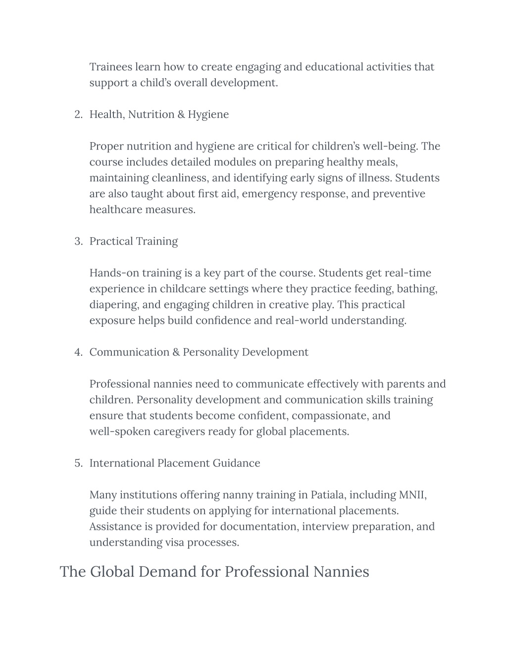 3. Trainees learn how to create engaging and educational activities that support a child’s overall development. 2.Health, Nutrition & Hygiene Proper nutrition and hygiene are critical for children’s well-being. The course includes detailed modules on preparing healthy meals, maintaining cleanliness, and identifying early signs of illness. Students are also taught about first aid, emergency response, and preventive healthcare measures. 3.Practical Training Hands-on training is a key part of the course. Students get real-time experience in childcare settings where they practice feeding, bathing, diapering, and engaging children in creative play. This practical exposure helps build confidence and real-world understanding. 4.Communication & Personality Development Professional nannies need to communicate effectively with parents and children. Personality development and communication skills training ensure that students become confident, compassionate, and well-spoken caregivers ready for global placements. 5.International Placement Guidance Many institutions offering nanny training in Patiala, including MNII, guide their students on applying for international placements. Assistance is provided for documentation, interview preparation, and understanding visa processes. The Global Demand for Professional Nannies