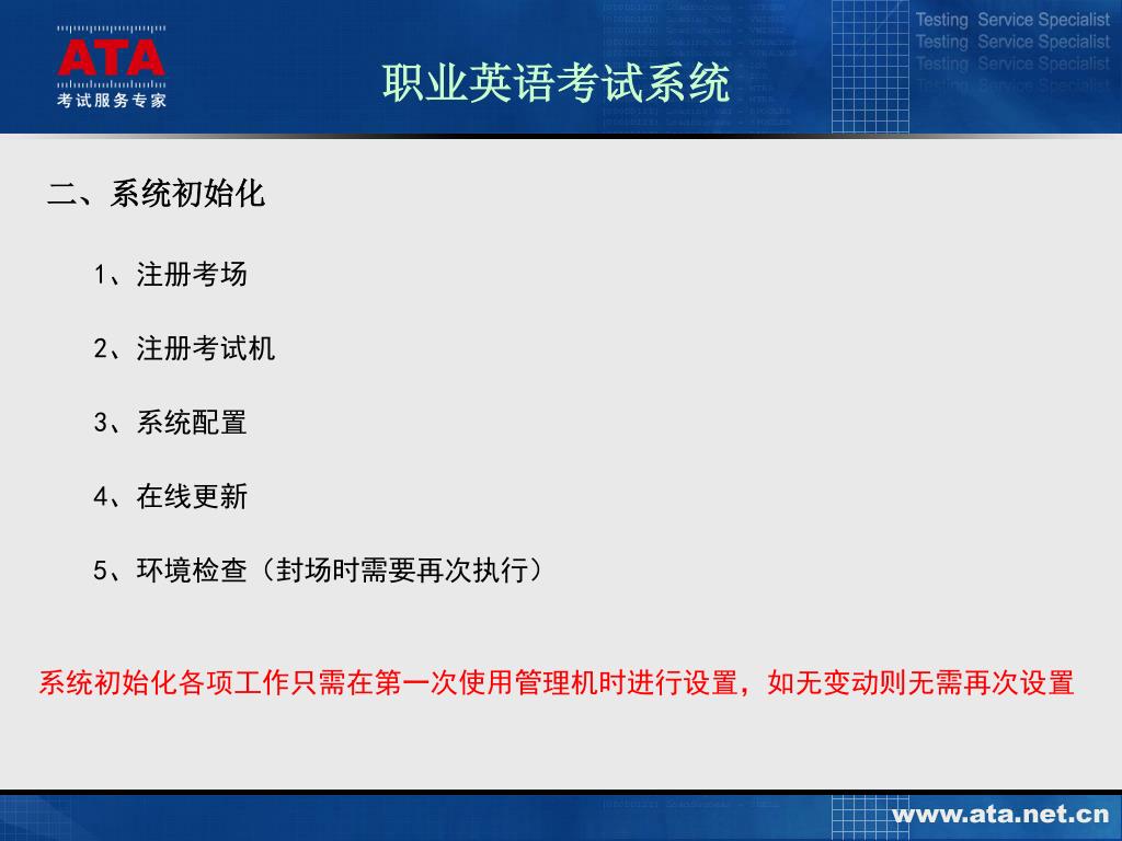 1、注册考场 2、注册考试机 3、系统配置 4、在线更新 5、环境检查(封场时需要再次执行) 系统初始化各项工作只需在第一次使用管理机时进行设置,如无变动则无需再次设置 职业英语考试系统 二、系统初始化