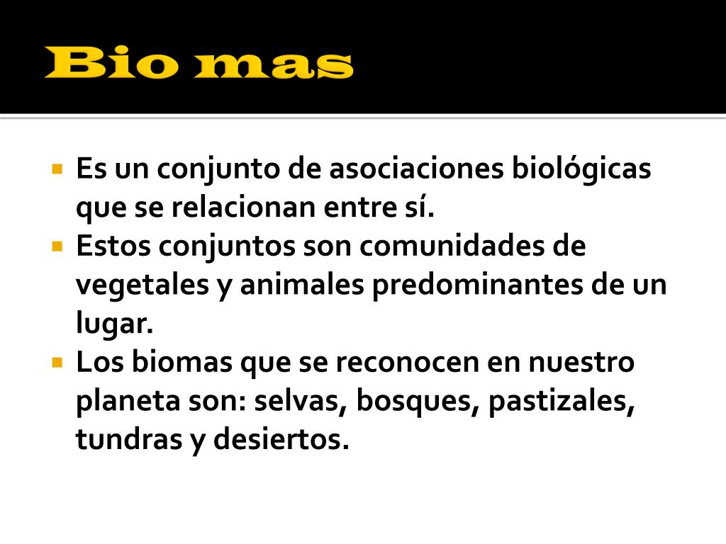 Bio mas • Es un conjunto de asociaciones biológicas que se relacionan entre sí. • Estos conjuntos son comunidades de vegetales y animales predominantes de un lugar. • Los biomas que se reconocen en nuestro planeta son: selvas, bosques, pastizales, tundras y desiertos.