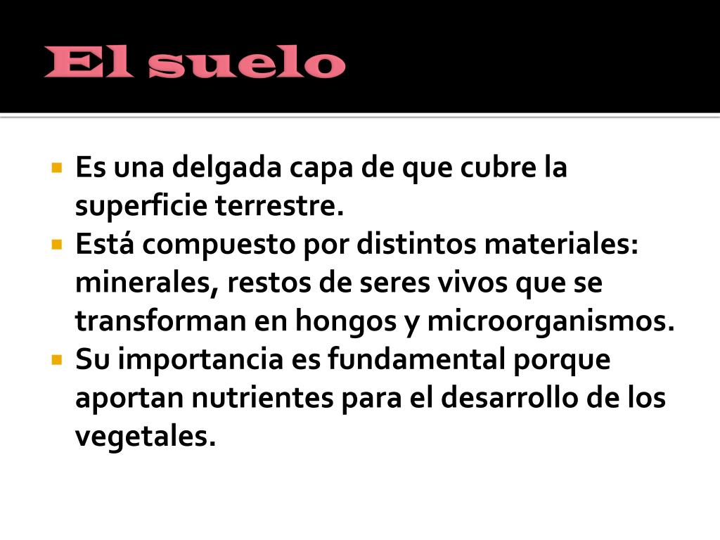 El suelo • Es una delgada capa de que cubre la superficie terrestre. • Está compuesto por distintos materiales: minerales, restos de seres vivos que se transforman en hongos y microorganismos. • Su importancia es fundamental porque aportan nutrientes para el desarrollo de los vegetales.