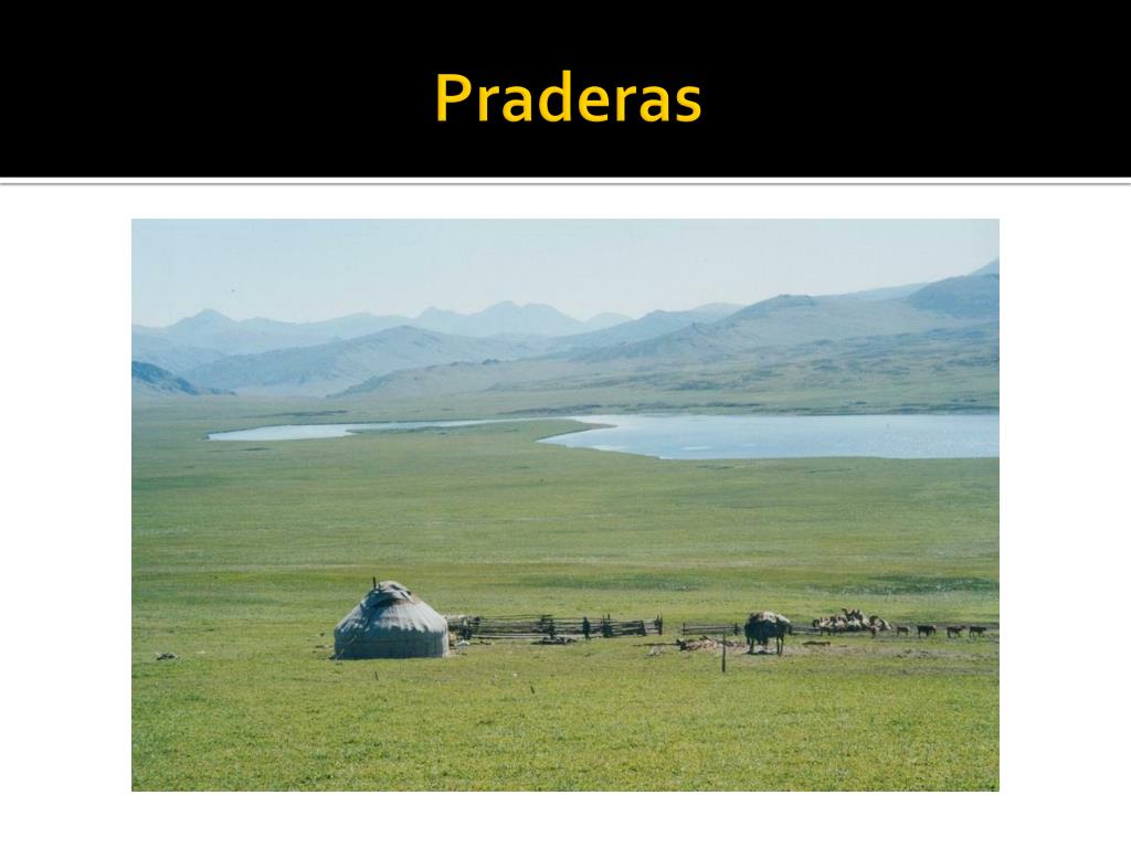 Los pastizales • Son biomas donde predominan las hierbas. • Entre ellos encontramos: • Las praderas. • Las estepas • La sabana • La pradera donde tiene un clima templado y precipitaciones regulares todo el año, con hiebas continuas y densas.