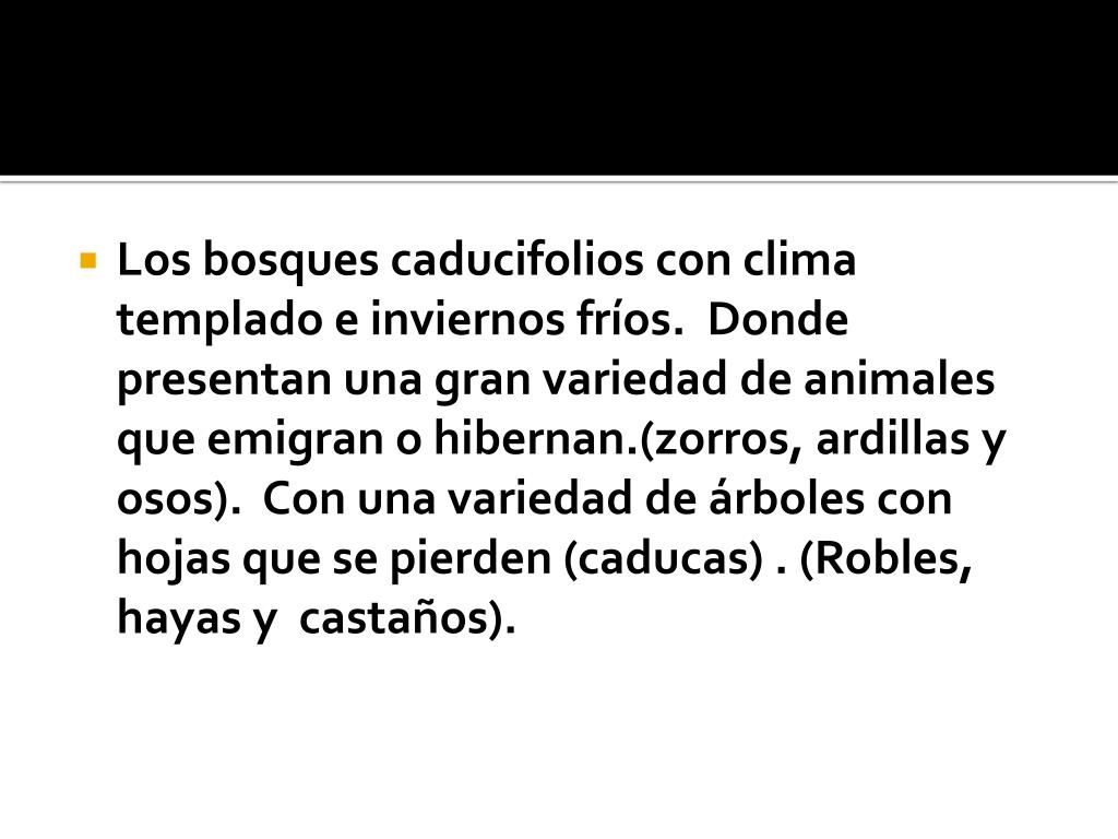Los bosques caducifolios con clima templado e inviernos fríos. Donde presentan una gran variedad de animales que emigran o hibernan.(zorros, ardillas y osos). Con una variedad de árboles con hojas que se pierden (caducas) . (Robles, hayas y castaños).