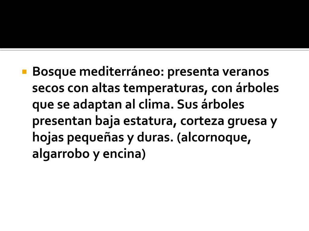 Bosque mediterráneo: presenta veranos secos con altas temperaturas, con árboles que se adaptan al clima. Sus árboles presentan baja estatura, corteza gruesa y hojas pequeñas y duras. (alcornoque, algarrobo y encina)