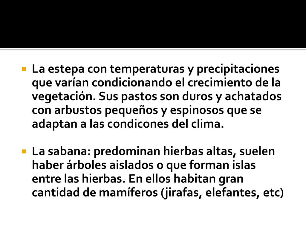 La estepa con temperaturas y precipitaciones que varíancondicionando el crecimiento de la vegetación. Sus pastos son duros y achatados con arbustospequeños y espinosos que se adaptan a las condicones del clima. • La sabana: predominanhierbasaltas, suelen haberárbolesaislados o que formanislas entre las hierbas. En elloshabitan gran cantidad de mamíferos (jirafas, elefantes, etc)