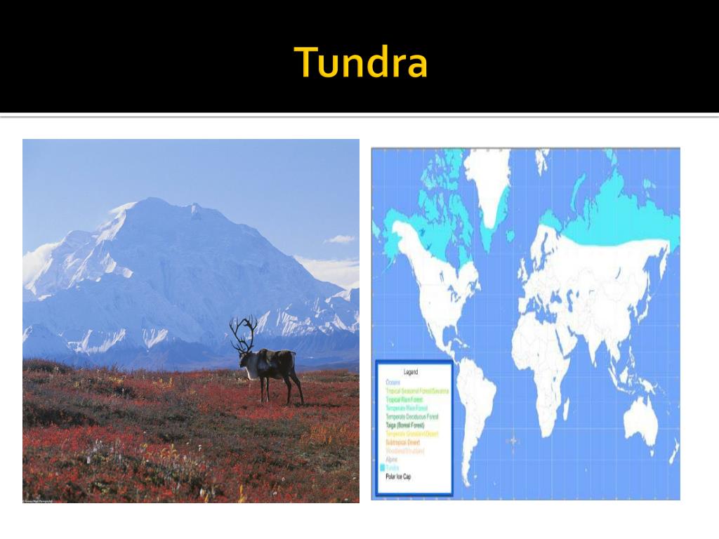 La tundra • Se desarrollan en regiones de clima muy frío y precipitaciones escasas. • Se lo encuentran en montañas y regionespolares. • En los inviernos el suelo se encuentra con nieve, en verano es cuando únicamentecrece la vegetación (hierbas, musgos, líquenes). • Hay animalesadaptados al fríoosos, caribúesalgunosemigran en invierno y otroshibernan.