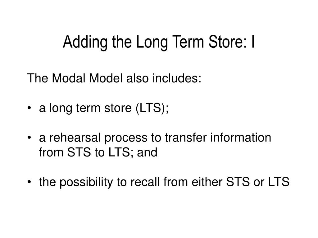 Adding the Long Term Store: I The Modal Model also includes: • a long term store (LTS); • a rehearsal process to transfer information from STS to LTS; and • the possibility to recall from either STS or LTS