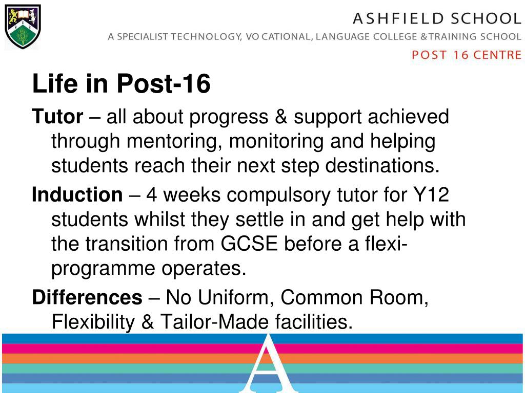 Life in Post-16 Tutor – all about progress & support achieved through mentoring, monitoring and helping students reach their next step destinations. Induction – 4 weeks compulsory tutor for Y12 students whilst they settle in and get help with the transition from GCSE before a flexi-programme operates. Differences – No Uniform, Common Room, Flexibility & Tailor-Made facilities.