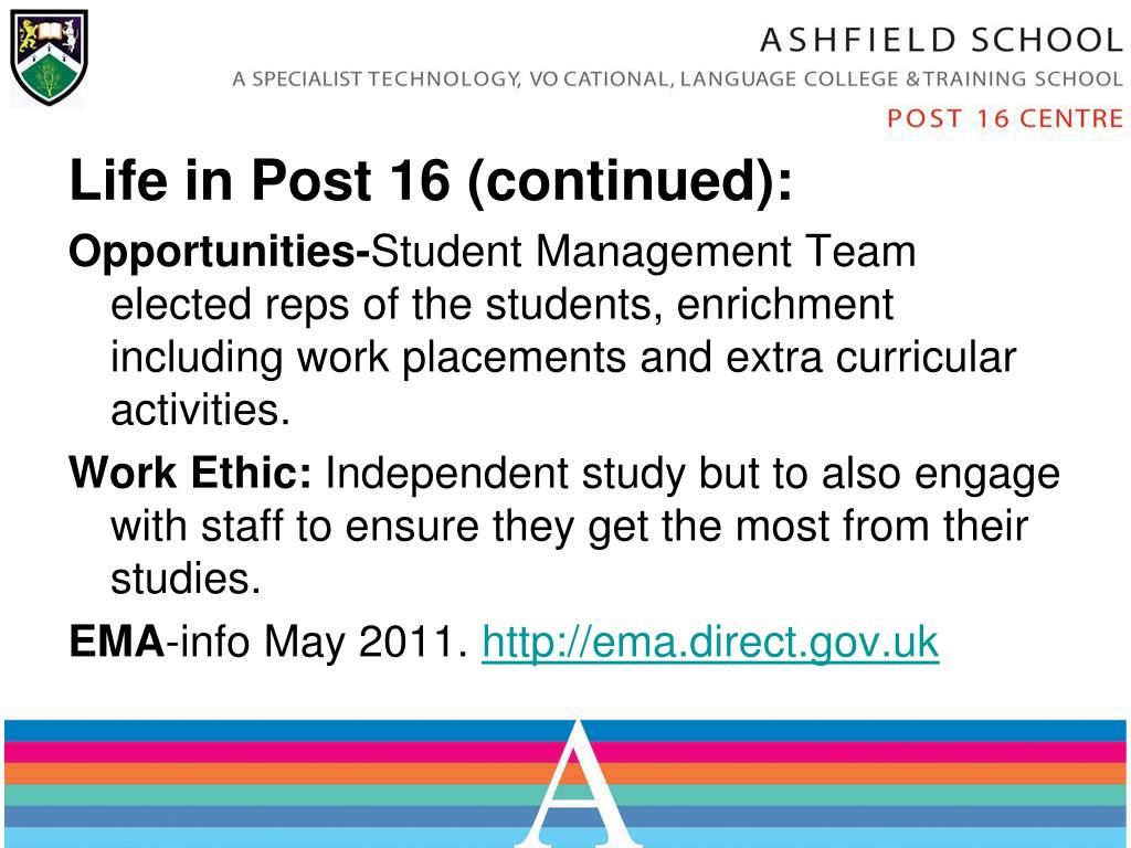 Life in Post 16 (continued): Opportunities-Student Management Team elected reps of the students, enrichment including work placements and extra curricular activities. Work Ethic: Independent study but to also engage with staff to ensure they get the most from their studies. EMA-info May 2011. http://ema.direct.gov.uk
