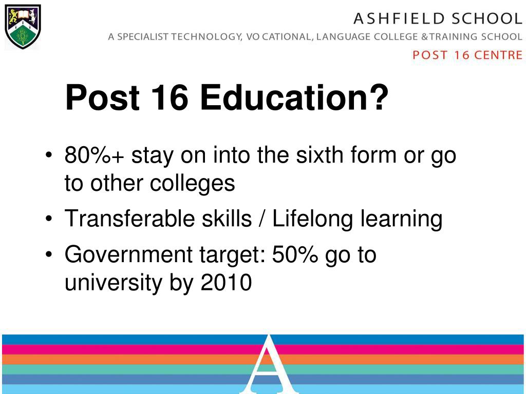 Post 16 Education? • 80%+ stay on into the sixth form or go to other colleges • Transferable skills / Lifelong learning • Government target: 50% go to university by 2010