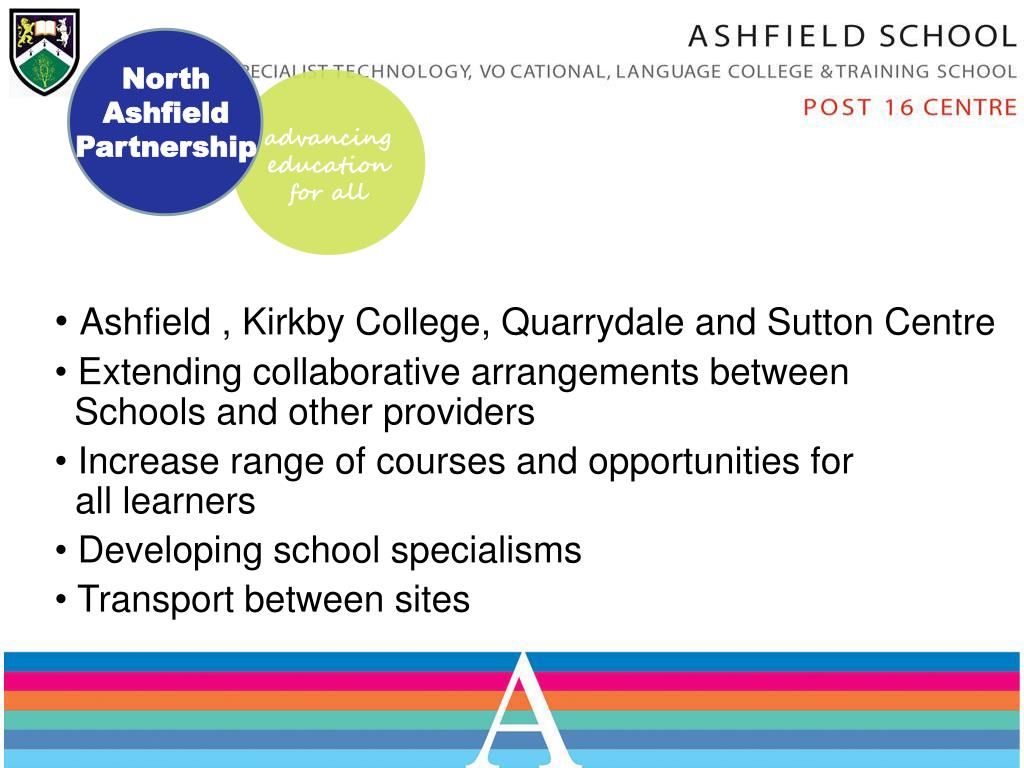 North Ashfield Partnership advancing education for all • Ashfield , Kirkby College, Quarrydale and Sutton Centre • Extending collaborative arrangements between • Schools and other providers • Increase range of courses and opportunities for • all learners • Developing school specialisms • Transport between sites