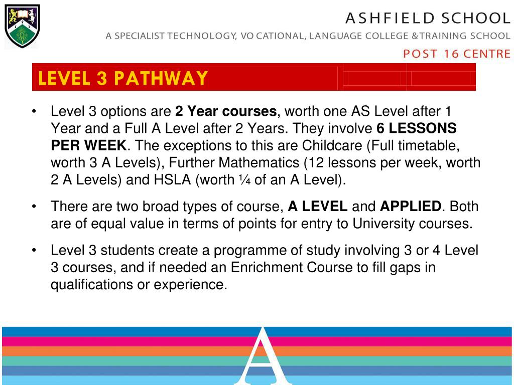 Level 3 options are 2 Year courses, worth one AS Level after 1 Year and a Full A Level after 2 Years. They involve 6 LESSONS PER WEEK. The exceptions to this are Childcare (Full timetable, worth 3 A Levels), Further Mathematics (12 lessons per week, worth 2 A Levels) and HSLA (worth ¼ of an A Level). • There are two broad types of course, A LEVEL and APPLIED. Both are of equal value in terms of points for entry to University courses. • Level 3 students create a programme of study involving 3 or 4 Level 3 courses, and if needed an Enrichment Course to fill gaps in qualifications or experience.