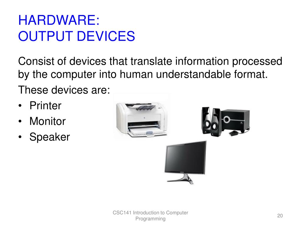 HARDWARE: OUTPUT DEVICES Consist of devices that translate information processed by the computer into human understandable format. These devices are: • Printer • Monitor • Speaker CSC141 Introduction to Computer Programming