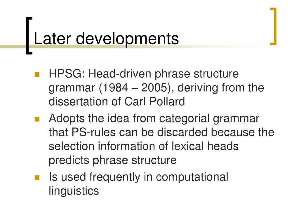 Later developments • HPSG: Head-driven phrase structure grammar (1984 – 2005), deriving from the dissertation of Carl Pollard • Adopts the idea from categorial grammar that PS-rules can be discarded because the selection information of lexical heads predicts phrase structure • Is used frequently in computational linguistics