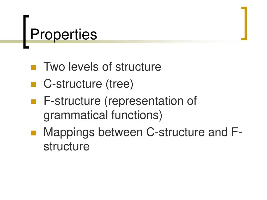 Properties • Two levels of structure • C-structure (tree) • F-structure (representation of grammatical functions) • Mappings between C-structure and F-structure