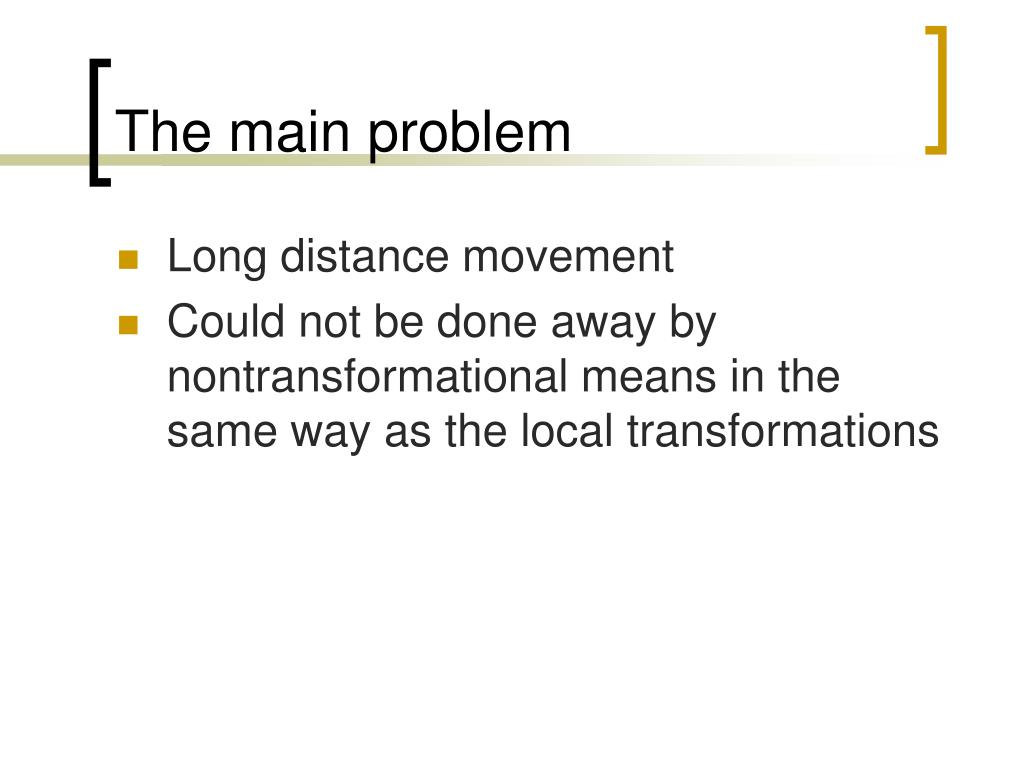 The main problem • Long distance movement • Could not be done away by nontransformational means in the same way as the local transformations