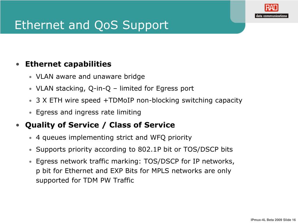 Ethernet and QoS Support • Ethernet capabilities • VLAN aware and unaware bridge • VLAN stacking, Q-in-Q – limited for Egress port • 3 X ETH wire speed +TDMoIP non-blocking switching capacity • Egress and ingress rate limiting • Quality of Service / Class of Service • 4 queues implementing strict and WFQ priority • Supports priority according to 802.1P bit or TOS/DSCP bits • Egress network traffic marking: TOS/DSCP for IP networks, p bit for Ethernet and EXP Bits for MPLS networks are only supported for TDM PW Traffic