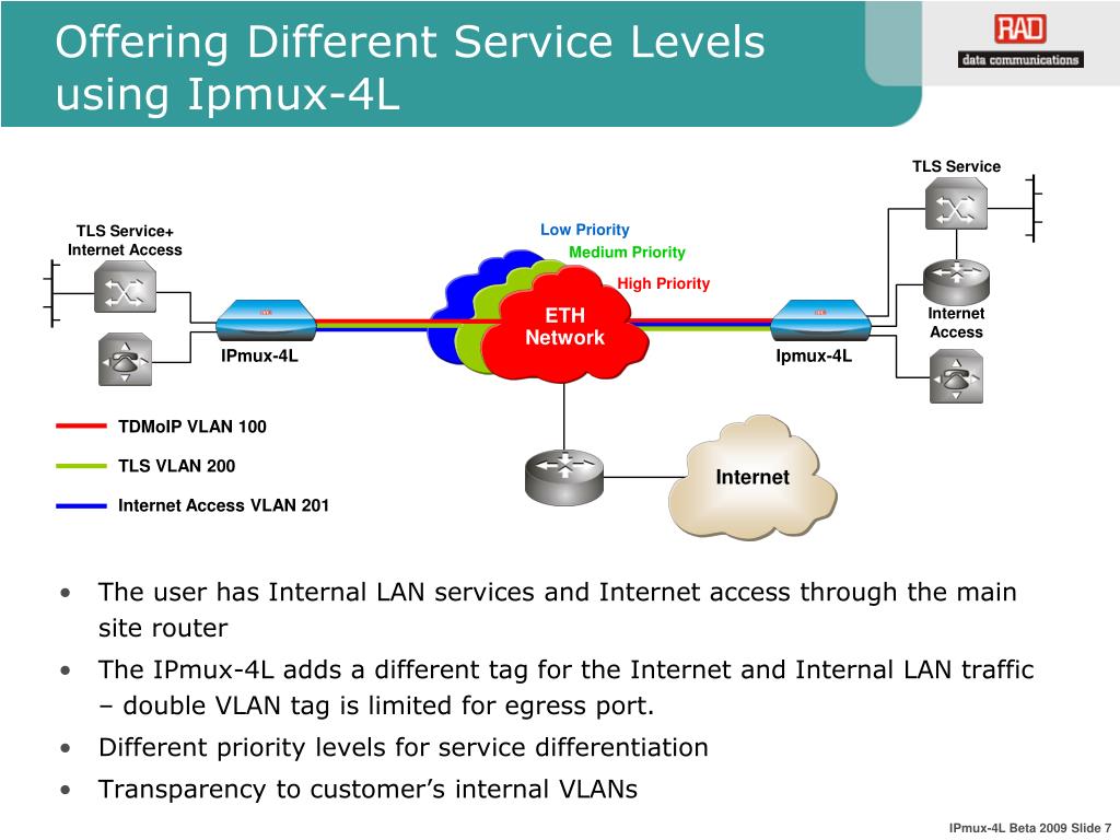 Offering Different Service Levels using Ipmux-4L TLS Service Low Priority • The user has Internal LAN services and Internet access through the main site router • The IPmux-4L adds a different tag for the Internet and Internal LAN traffic – double VLAN tag is limited for egress port. • Different priority levels for service differentiation • Transparency to customer’s internal VLANs TLS Service+ Internet Access Medium Priority High Priority Internet Access ETH Network IPmux-4L Ipmux-4L TDMoIP VLAN 100 TLS VLAN 200 Internet Internet Access VLAN 201