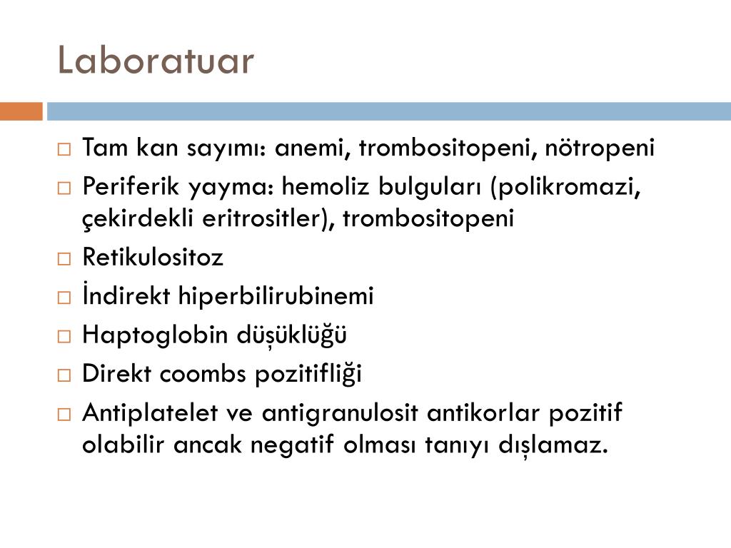 Laboratuar • Tam kan sayımı: anemi, trombositopeni, nötropeni • Periferik yayma: hemoliz bulguları (polikromazi, çekirdekli eritrositler), trombositopeni • Retikulositoz • İndirekt hiperbilirubinemi • Haptoglobin düşüklüğü • Direkt coombs pozitifliği • Antiplatelet ve antigranulosit antikorlar pozitif olabilir ancak negatif olması tanıyı dışlamaz.