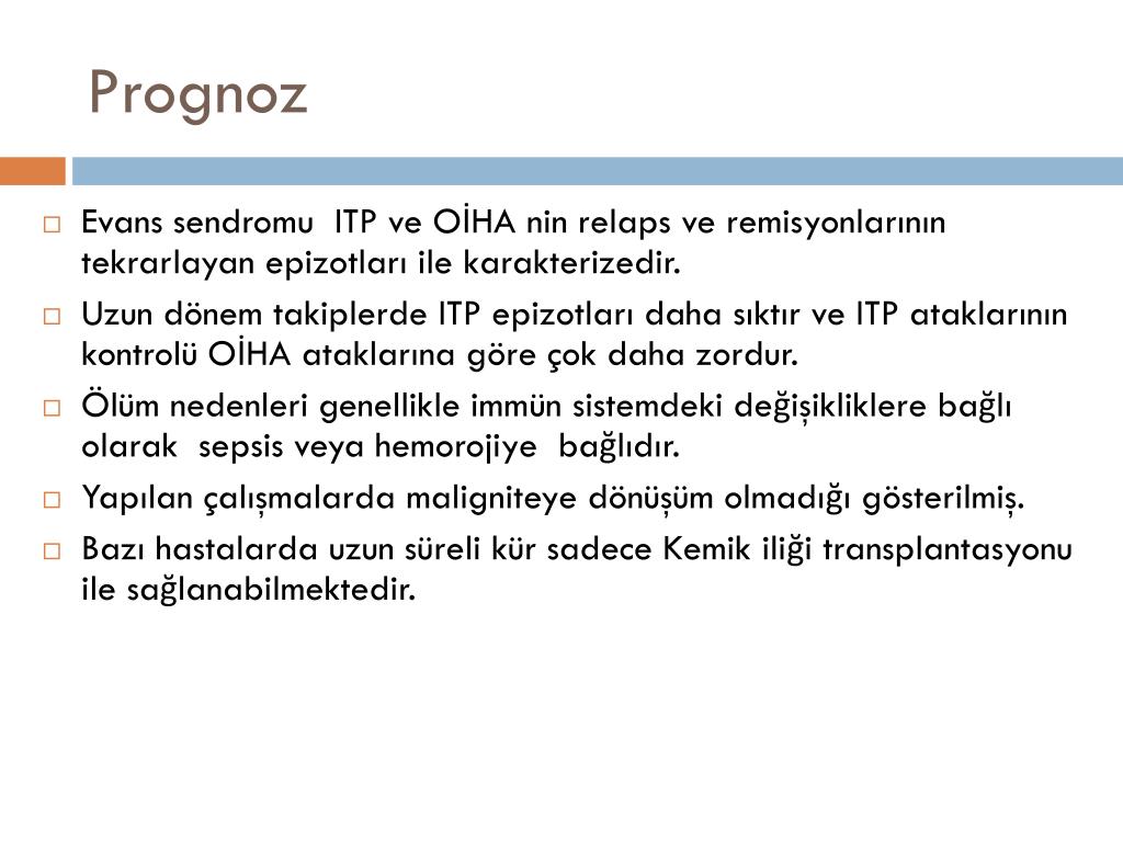 Prognoz • Evans sendromu ITP ve OİHA nin relaps ve remisyonlarının tekrarlayan epizotları ile karakterizedir. • Uzun dönem takiplerde ITP epizotları daha sıktır ve ITP ataklarının kontrolü OİHA ataklarına göre çok daha zordur. • Ölüm nedenleri genellikle immün sistemdeki değişikliklere bağlı olarak sepsis veya hemorojiye bağlıdır. • Yapılan çalışmalarda maligniteye dönüşüm olmadığı gösterilmiş. • Bazı hastalarda uzun süreli kür sadece Kemik iliği transplantasyonu ile sağlanabilmektedir.