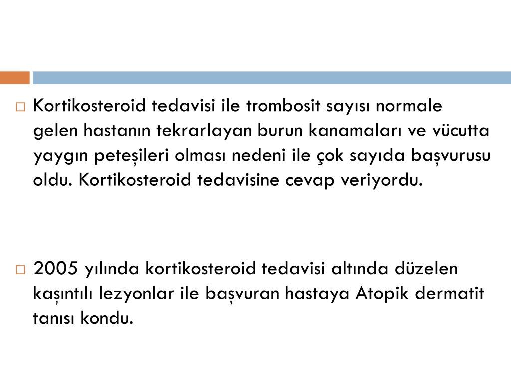 Kortikosteroid tedavisi ile trombosit sayısı normale gelen hastanın tekrarlayan burun kanamaları ve vücutta yaygın peteşileri olması nedeni ile çok sayıda başvurusu oldu. Kortikosteroid tedavisine cevap veriyordu. • 2005 yılında kortikosteroid tedavisi altında düzelen kaşıntılı lezyonlar ile başvuran hastaya Atopik dermatit tanısı kondu.