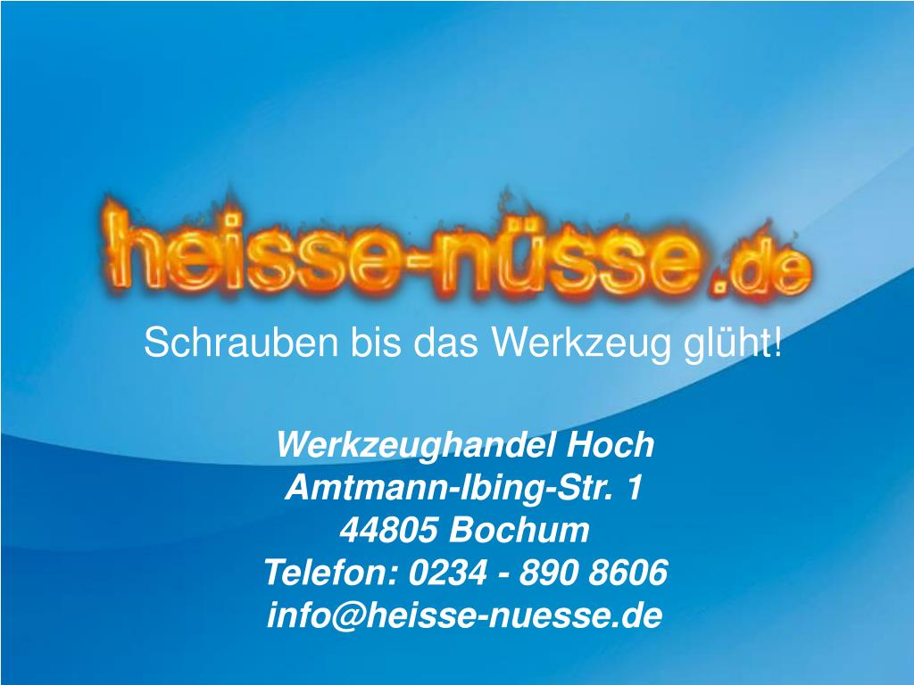 Schrauben bis das Werkzeug glüht! Werkzeughandel Hoch Amtmann-Ibing-Str. 1 44805 Bochum Telefon: 0234 - 890 8606 info@heisse-nuesse.de