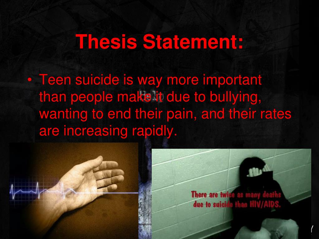 Teen Suicide ): . By: Harmony Moore (:. Thesis Statement:. Teen suicide is way more important than people make it due to bullying, wanting to end their pain, and their rates are increasing ra pidly . Paragraph One Topic Sentence :.