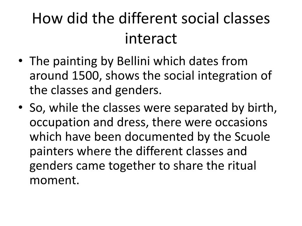 How did the different social classes interact • The painting by Bellini which dates from around 1500, shows the social integration of the classes and genders. • So, while the classes were separated by birth, occupation and dress, there were occasions which have been documented by the Scuole painters where the different classes and genders came together to share the ritual moment.