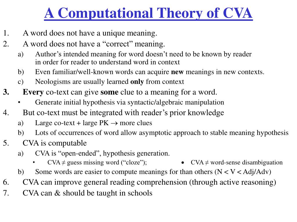 A Computational Theory of CVA • A word does not have a unique meaning. • A word does not have a “correct” meaning. • Author’s intended meaning for word doesn’t need to be known by readerin order for reader to understand word in context • Even familiar/well-known words can acquire new meanings in new contexts. • Neologisms are usually learned only from context • Every co-text can give some clue to a meaning for a word. • Generate initial hypothesis via syntactic/algebraic manipulation • But co-text must be integrated with reader’s prior knowledge • Large co-text + large PK more clues • Lots of occurrences of word allow asymptotic approach to stable meaning hypothesis • CVA is computable • CVA is “open-ended”, hypothesis generation. • CVA ≠ guess missing word (“cloze”); CVA ≠ word-sense disambiguation • Some words are easier to compute meanings for than others (N < V < Adj/Adv) • CVA can improve general reading comprehension (through active reasoning) • CVA can & should be taught in schools