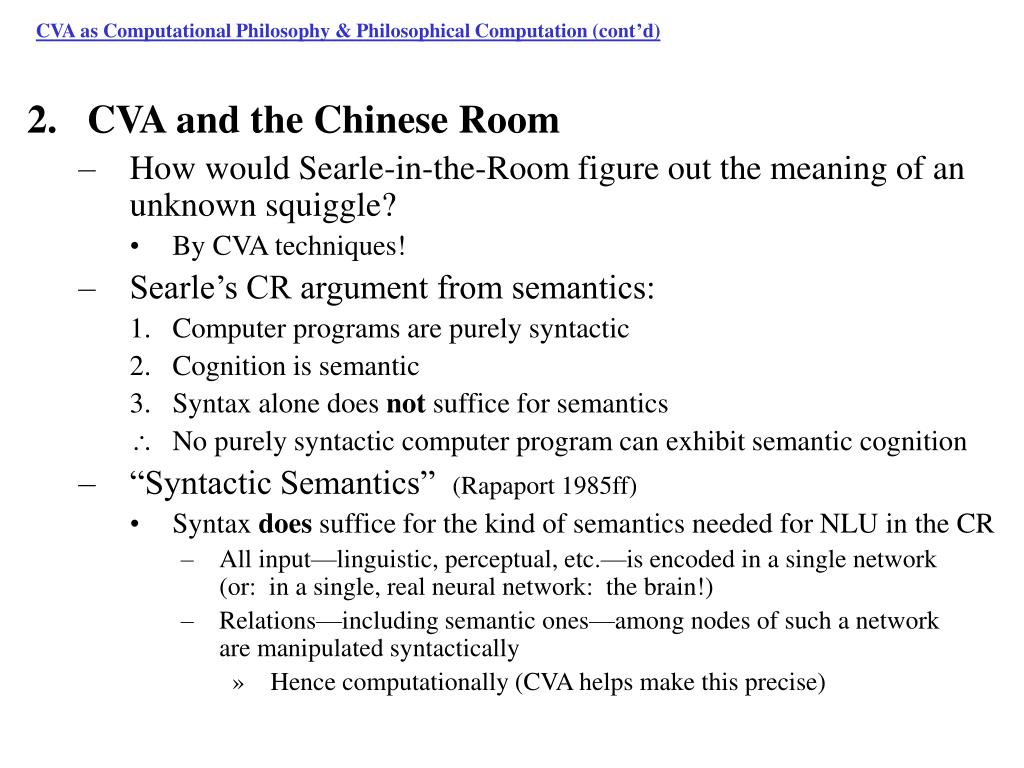 CVA as Computational Philosophy & Philosophical Computation (cont’d) • CVA and the Chinese Room • How would Searle-in-the-Room figure out the meaning of an unknown squiggle? • By CVA techniques! • Searle’s CR argument from semantics: • Computer programs are purely syntactic • Cognition is semantic • Syntax alone does not suffice for semantics No purely syntactic computer program can exhibit semantic cognition • “Syntactic Semantics” (Rapaport 1985ff) • Syntax does suffice for the kind of semantics needed for NLU in the CR • All input—linguistic, perceptual, etc.—is encoded in a single network(or: in a single, real neural network: the brain!) • Relations—including semantic ones—among nodes of such a networkare manipulated syntactically • Hence computationally (CVA helps make this precise)