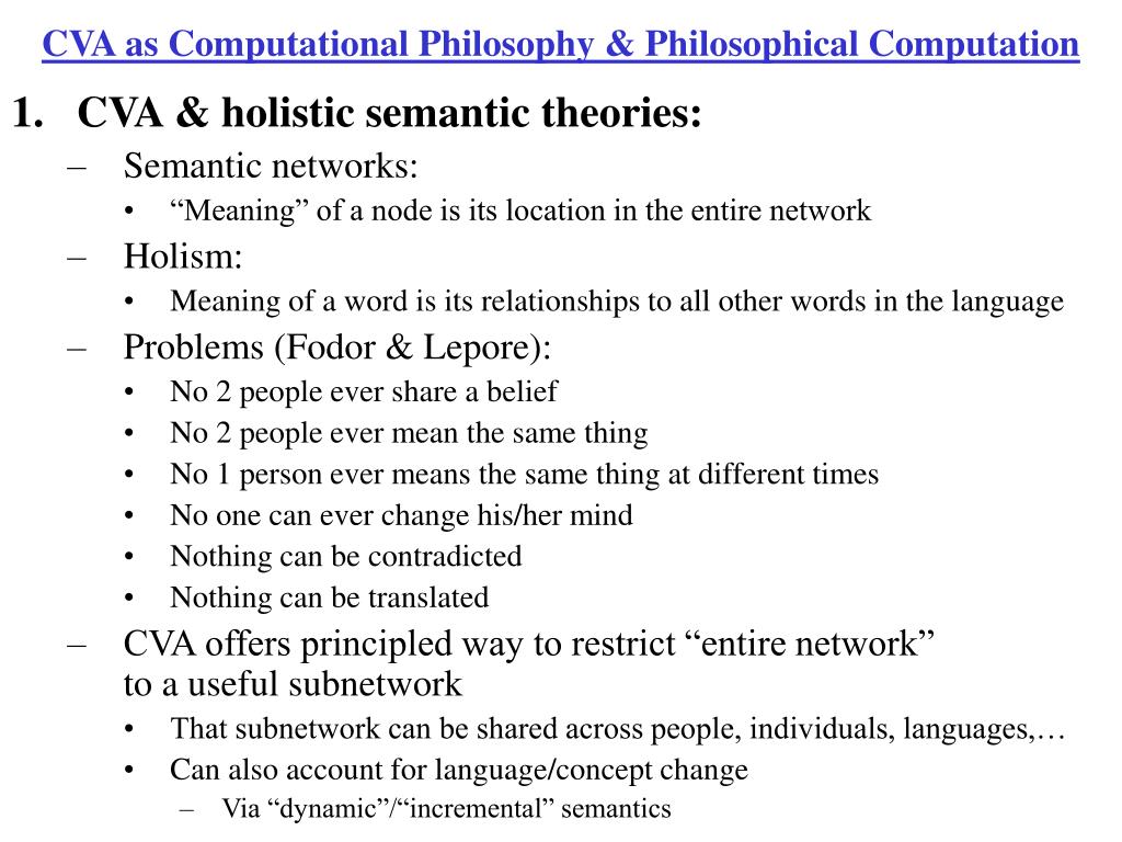 CVA as Computational Philosophy & Philosophical Computation • CVA & holistic semantic theories: • Semantic networks: • “Meaning” of a node is its location in the entire network • Holism: • Meaning of a word is its relationships to all other words in the language • Problems (Fodor & Lepore): • No 2 people ever share a belief • No 2 people ever mean the same thing • No 1 person ever means the same thing at different times • No one can ever change his/her mind • Nothing can be contradicted • Nothing can be translated • CVA offers principled way to restrict “entire network”to a useful subnetwork • That subnetwork can be shared across people, individuals, languages,… • Can also account for language/concept change • Via “dynamic”/“incremental” semantics