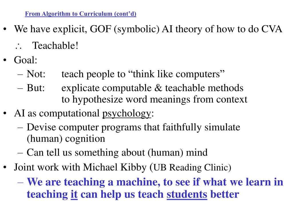 From Algorithm to Curriculum (cont’d) • We have explicit, GOF (symbolic) AI theory of how to do CVA Teachable! • Goal: • Not: teach people to “think like computers” • But: explicate computable & teachable methods to hypothesize word meanings from context • AI as computational psychology: • Devise computer programs that faithfully simulate(human) cognition • Can tell us something about (human) mind • Joint work with Michael Kibby (UB Reading Clinic) • We are teaching a machine, to see if what we learn in teaching it can help us teach students better