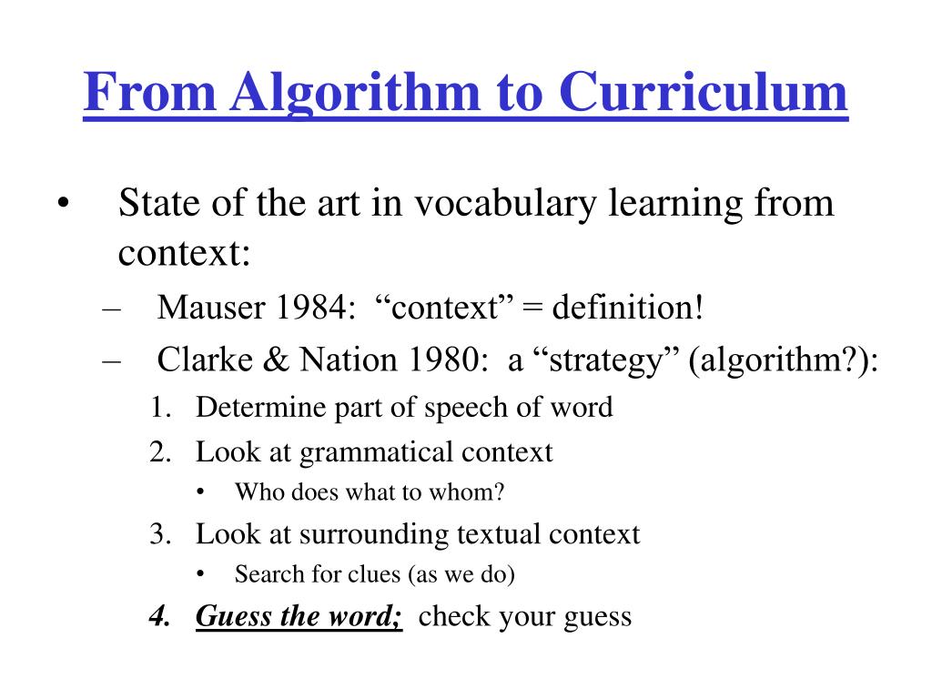 From Algorithm to Curriculum • State of the art in vocabulary learning from context: • Mauser 1984: “context” = definition! • Clarke & Nation 1980: a “strategy” (algorithm?): • Determine part of speech of word • Look at grammatical context • Who does what to whom? • Look at surrounding textual context • Search for clues (as we do) • Guess the word; check your guess