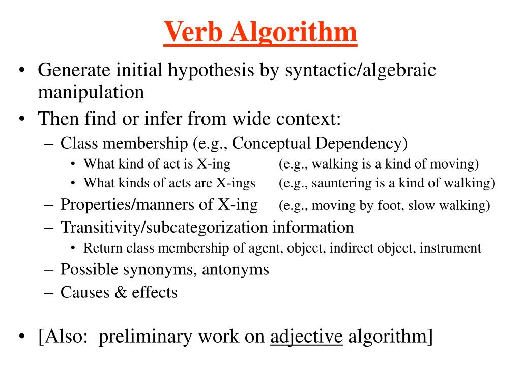 Verb Algorithm • Generate initial hypothesis by syntactic/algebraic manipulation • Then find or infer from wide context: • Class membership (e.g., Conceptual Dependency) • What kind of act is X-ing (e.g., walking is a kind of moving) • What kinds of acts are X-ings (e.g., sauntering is a kind of walking) • Properties/manners of X-ing (e.g., moving by foot, slow walking) • Transitivity/subcategorization information • Return class membership of agent, object, indirect object, instrument • Possible synonyms, antonyms • Causes & effects • [Also: preliminary work on adjective algorithm]