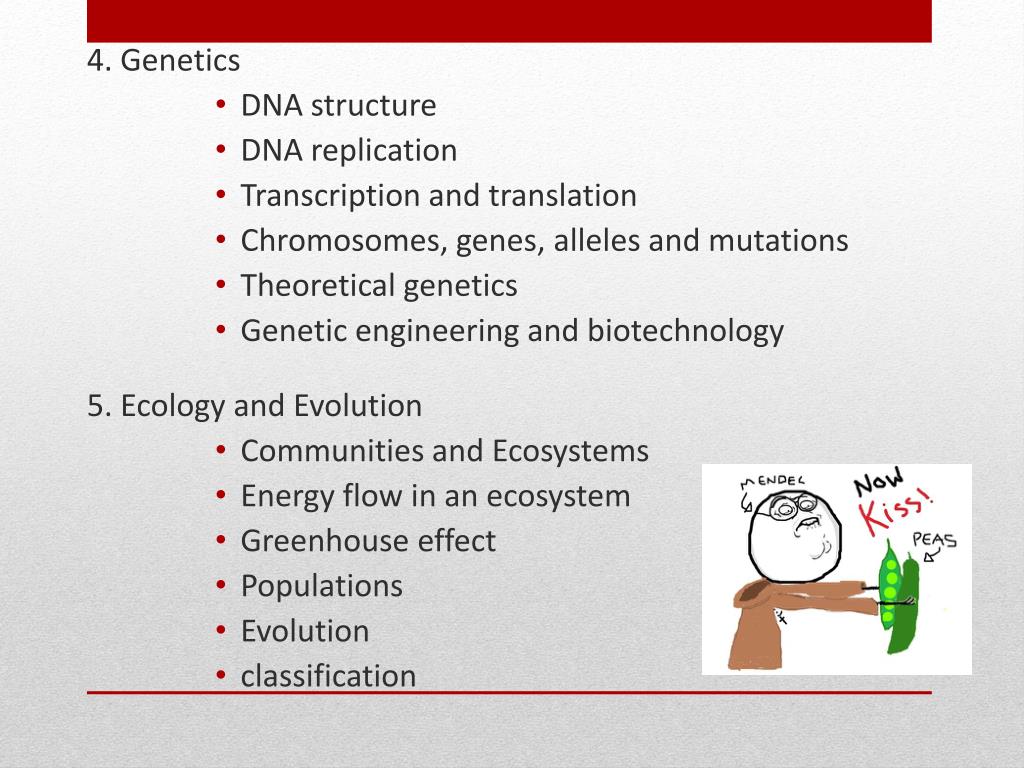 4. Genetics • DNA structure • DNA replication • Transcription and translation • Chromosomes, genes, alleles and mutations • Theoretical genetics • Genetic engineering and biotechnology 5. Ecology and Evolution • Communities and Ecosystems • Energyflow in anecosystem • Greenhouseeffect • Populations • Evolution • classification