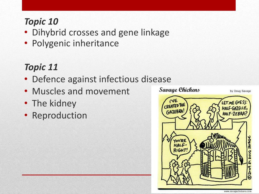 Topic 10 • Dihybrid crosses and gene linkage • Polygenic inheritance Topic 11 • Defence against infectious disease • Muscles and movement • The kidney • Reproduction