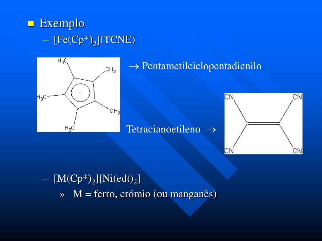 Pentametilciclopentadienilo • Exemplo • [Fe(Cp*)2](TCNE) • [M(Cp*)2][Ni(edt)2] • M = ferro, crómio (ou manganês) Tetracianoetileno