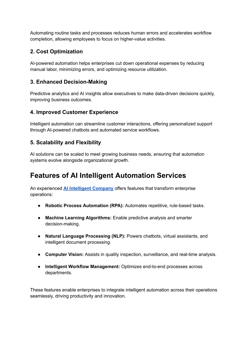 Automating routine tasks and processes reduces human errors and accelerates workflow completion, allowing employees to focus on higher-value activities. 2. Cost Optimization AI-powered automation helps enterprises cut down operational expenses by reducing manual labor, minimizing errors, and optimizing resource utilization. 3. Enhanced Decision-Making Predictive analytics and AI insights allow executives to make data-driven decisions quickly, improving business outcomes. 4. Improved Customer Experience Intelligent automation can streamline customer interactions, offering personalized support through AI-powered chatbots and automated service workflows. 5. Scalability and Flexibility AI solutions can be scaled to meet growing business needs, ensuring that automation systems evolve alongside organizational growth. Features of AI Intelligent Automation Services An experienced AI Intelligent Company offers features that transform enterprise operations: ● Robotic Process Automation (RPA): Automates repetitive, rule-based tasks. ● Machine Learning Algorithms: Enable predictive analysis and smarter decision-making. ● Natural Language Processing (NLP): Powers chatbots, virtual assistants, and intelligent document processing. ● Computer Vision: Assists in quality inspection, surveillance, and real-time analysis. ● Intelligent Workflow Management: Optimizes end-to-end processes across departments. These features enable enterprises to integrate intelligent automation across their operations seamlessly, driving productivity and innovation.