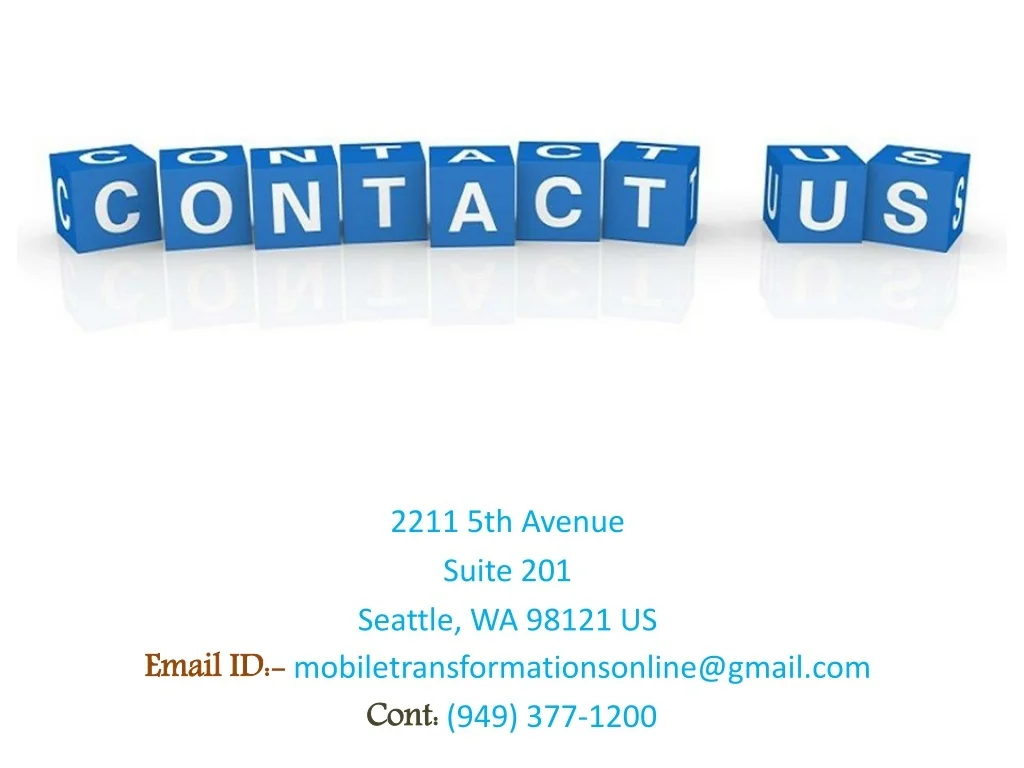 2211 5th Avenue Suite 201 Seattle, WA 98121 US Email ID:-mobiletransformationsonline@gmail.com Cont:(949) 377-1200