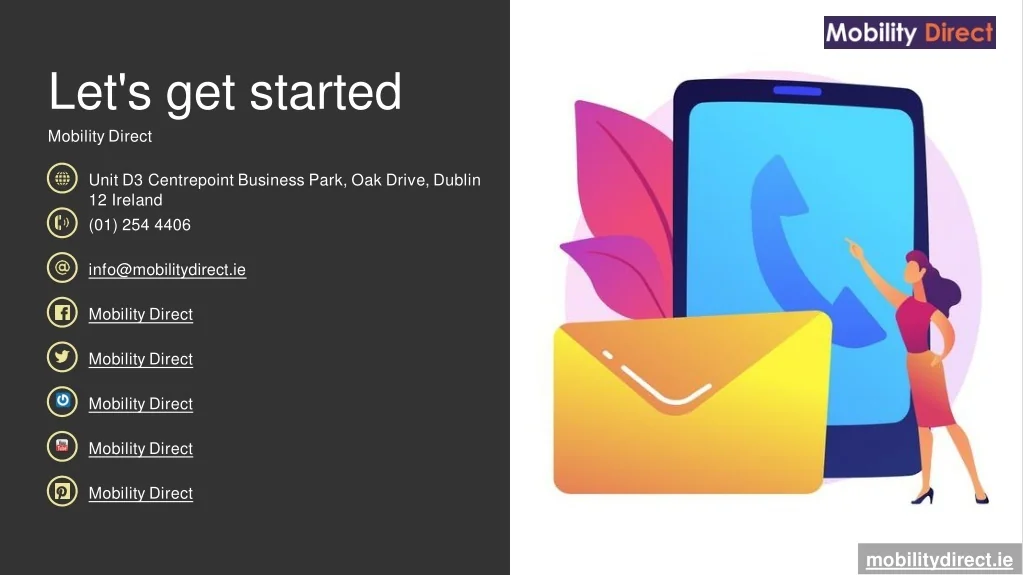 Let's get started Mobility Direct Unit D3 Centrepoint Business Park, Oak Drive, Dublin 12 Ireland (01) 254 4406 info@mobilitydirect.ie Mobility Direct Mobility Direct Mobility Direct Mobility Direct Mobility Direct mobilitydirect.ie