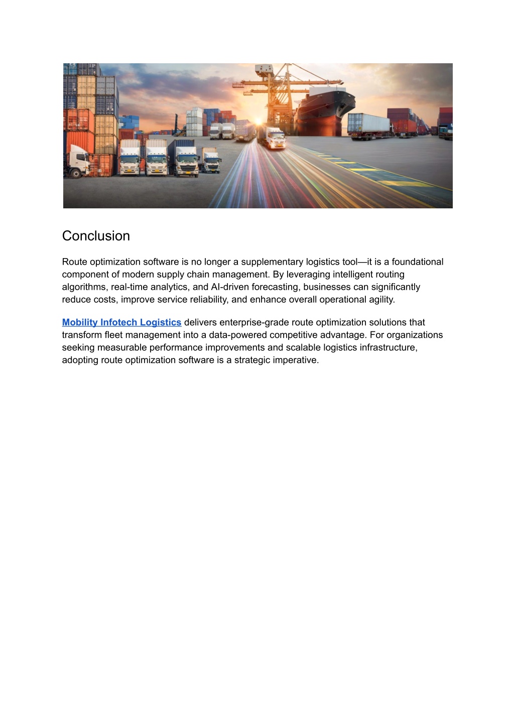 Conclusion Route optimization software is no longer a supplementary logistics tool—it is a foundational component of modern supply chain management. By leveraging intelligent routing algorithms, real-time analytics, and AI-driven forecasting, businesses can significantly reduce costs, improve service reliability, and enhance overall operational agility. Mobility Infotech Logistics delivers enterprise-grade route optimization solutions that transform fleet management into a data-powered competitive advantage. For organizations seeking measurable performance improvements and scalable logistics infrastructure, adopting route optimization software is a strategic imperative.