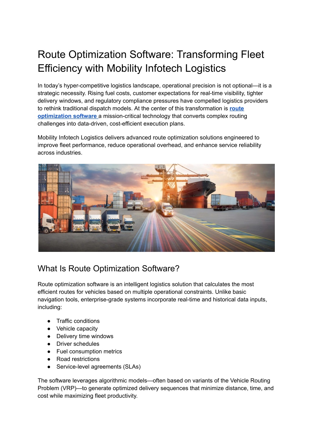 Route Optimization Software: Transforming Fleet Efficiency with Mobility Infotech Logistics In today’s hyper-competitive logistics landscape, operational precision is not optional—it is a strategic necessity. Rising fuel costs, customer expectations for real-time visibility, tighter delivery windows, and regulatory compliance pressures have compelled logistics providers to rethink traditional dispatch models. At the center of this transformation is route optimization software a mission-critical technology that converts complex routing challenges into data-driven, cost-efficient execution plans. Mobility Infotech Logistics delivers advanced route optimization solutions engineered to improve fleet performance, reduce operational overhead, and enhance service reliability across industries. What Is Route Optimization Software? Route optimization software is an intelligent logistics solution that calculates the most efficient routes for vehicles based on multiple operational constraints. Unlike basic navigation tools, enterprise-grade systems incorporate real-time and historical data inputs, including: ● Traffic conditions ● Vehicle capacity ● Delivery time windows ● Driver schedules ● Fuel consumption metrics ● Road restrictions ● Service-level agreements (SLAs) The software leverages algorithmic models—often based on variants of the Vehicle Routing Problem (VRP)—to generate optimized delivery sequences that minimize distance, time, and cost while maximizing fleet productivity.